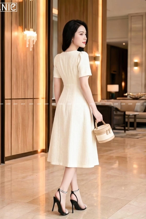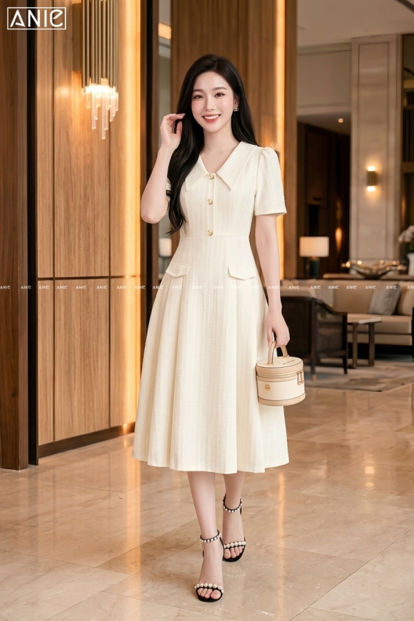 Đầm Kem Xếp Ly Đính Cúc Gold - AN2658