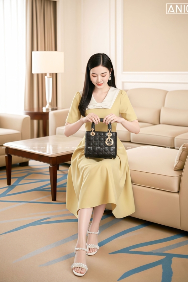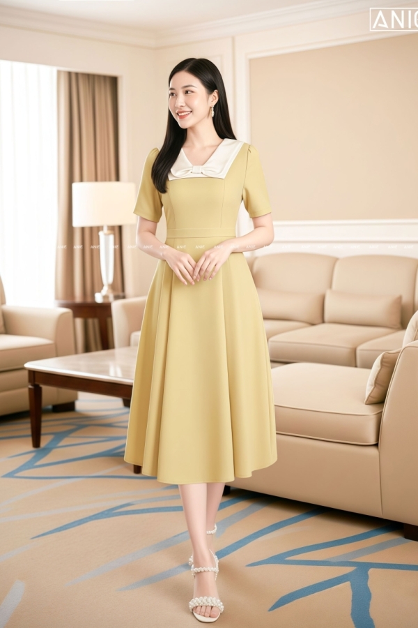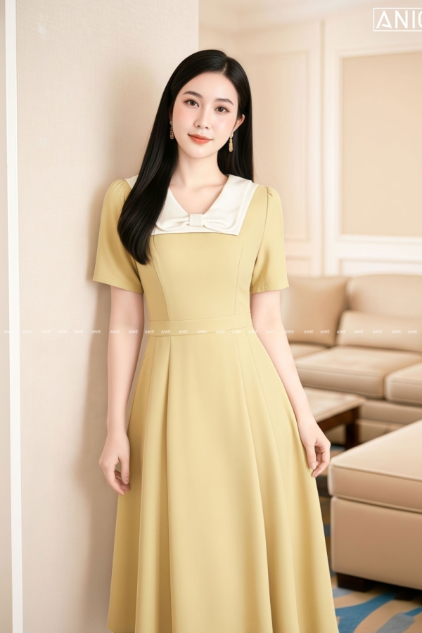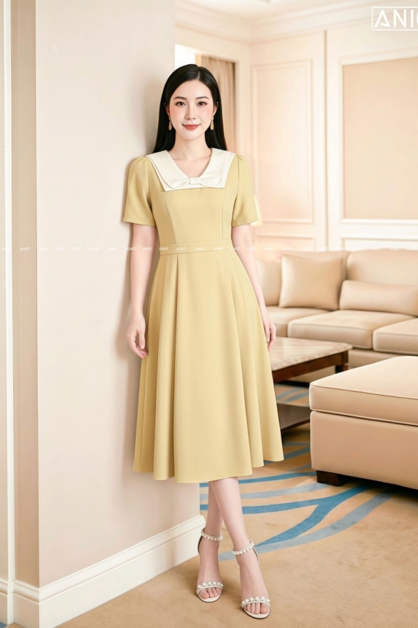 Đầm Vàng Nơ Phối Cổ Kem - AN2624