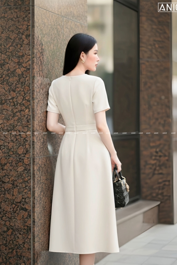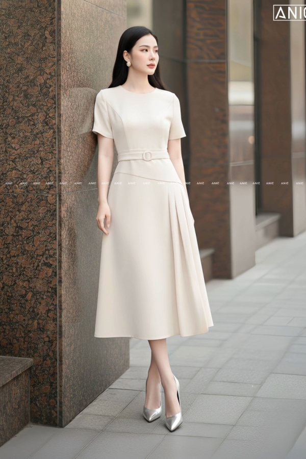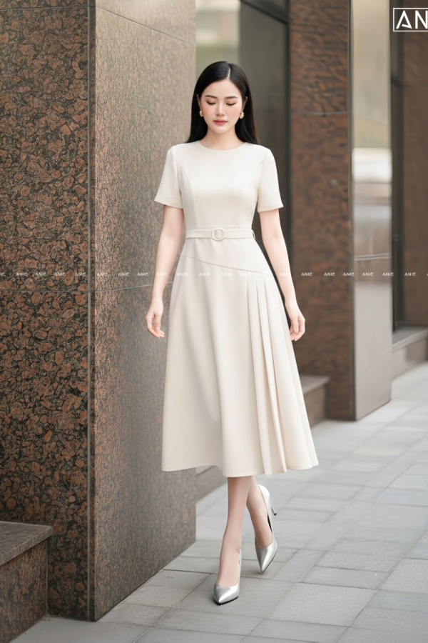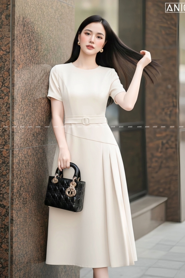 Đầm Xếp Ly Đai Liền Xám Be - AN2645