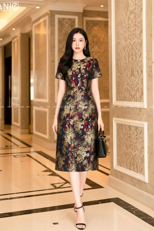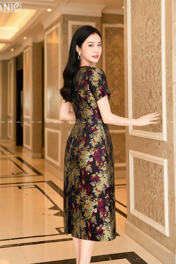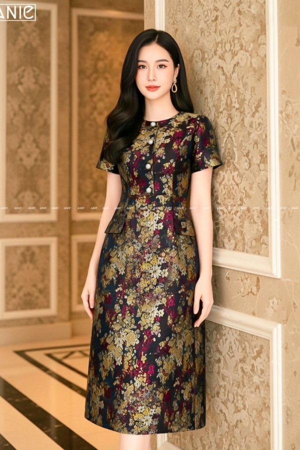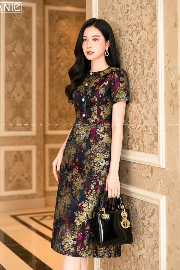Đầm Gấm Khuy Hoa Mai Cách Điệu - AN2611