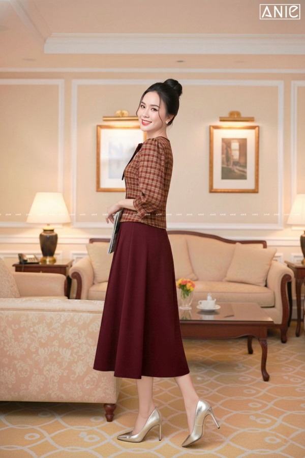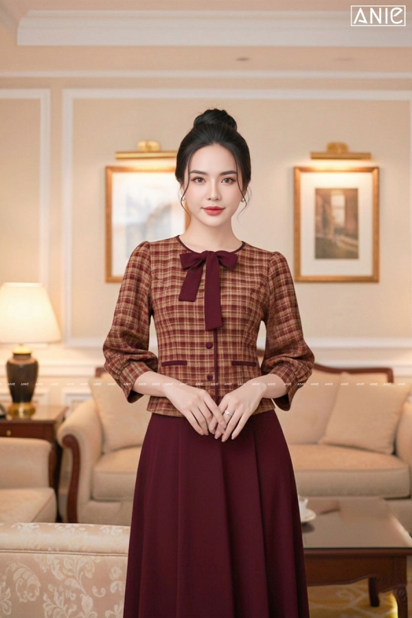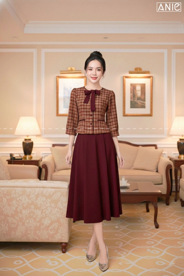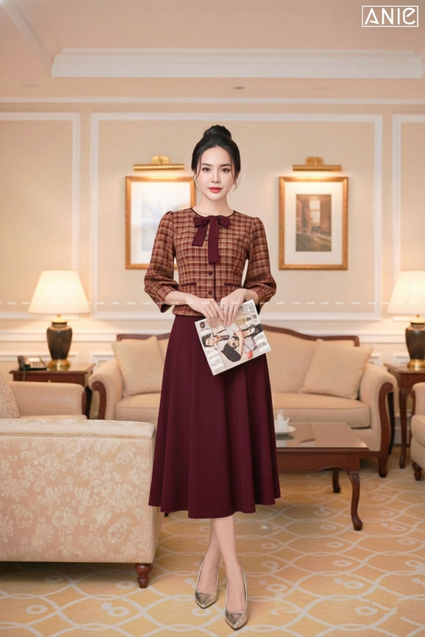 SET Áo Váy Caro Đỏ Nâu - AN2587