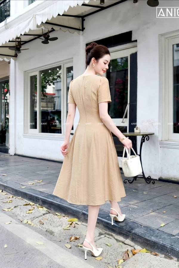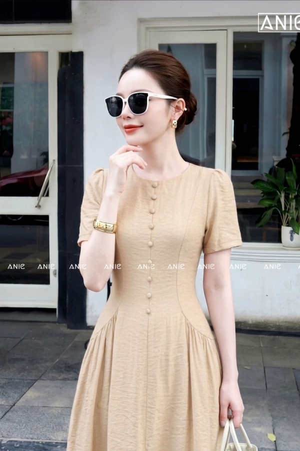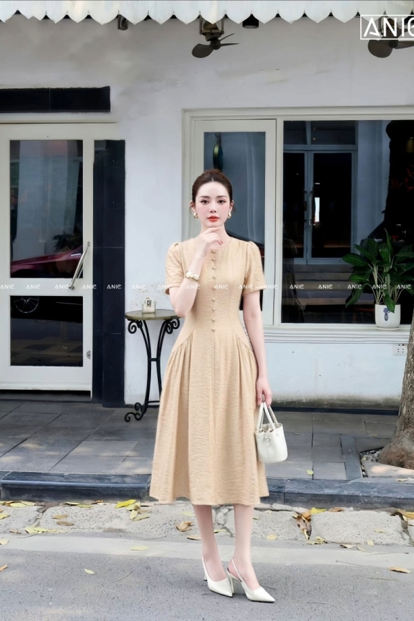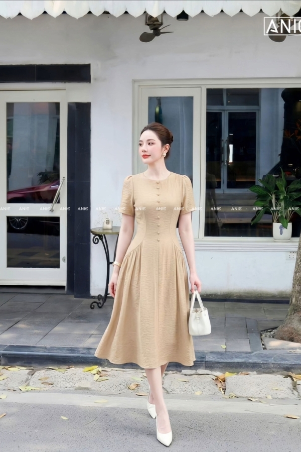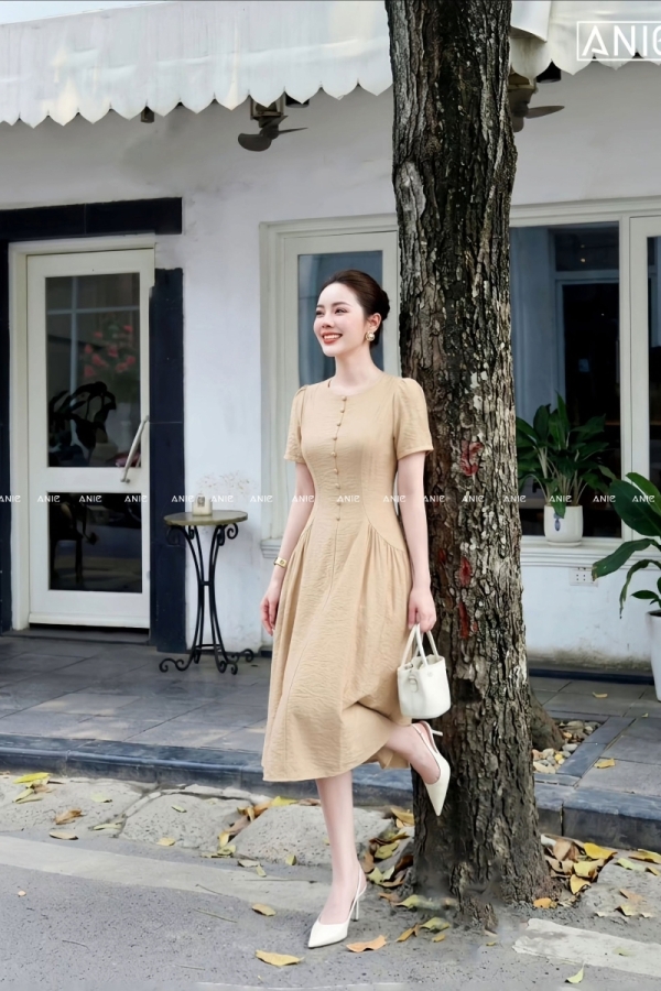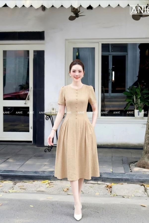 Đầm Be Nâu Nhún Eo Nút Bọc - AN2697