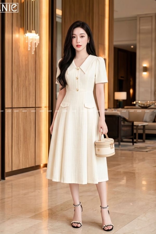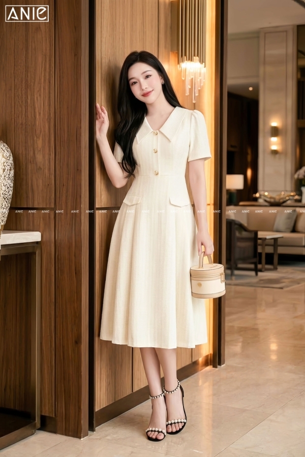 Đầm Kem Xếp Ly Đính Cúc Gold - AN2658
