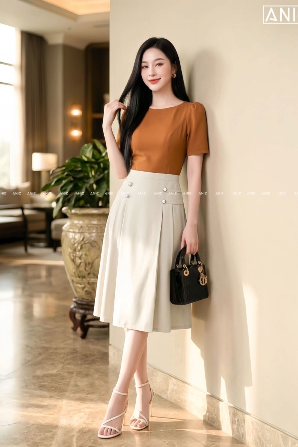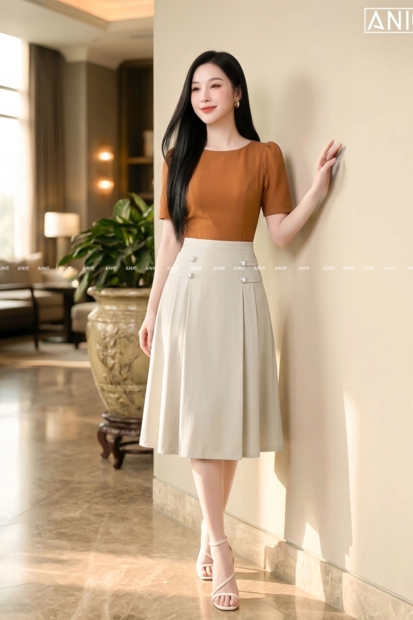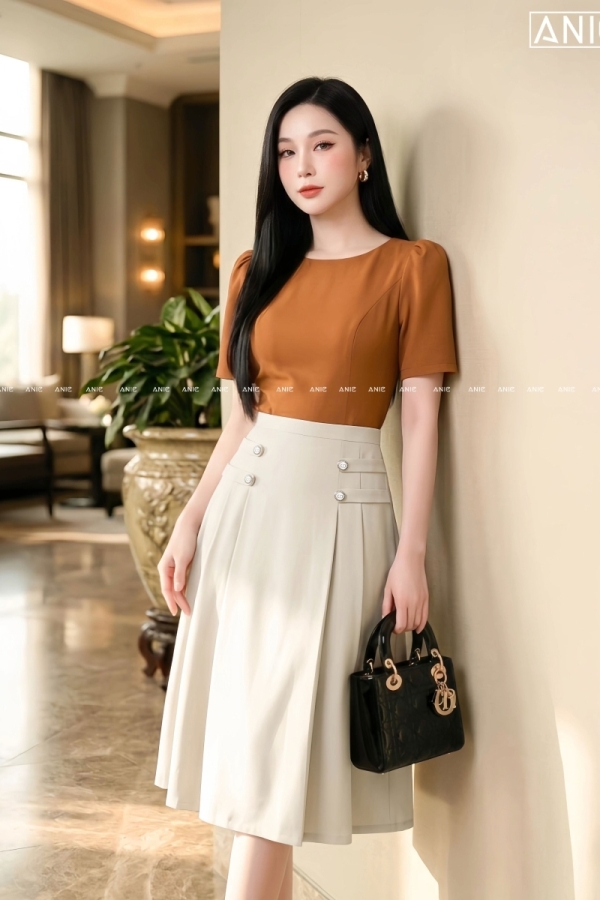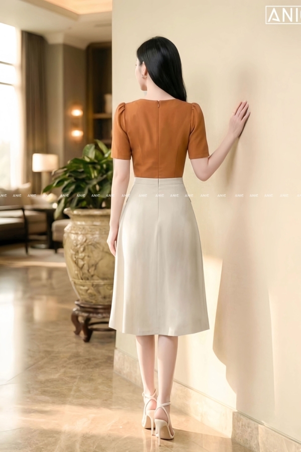 Đầm Liền Xếp Ly Cam Be - AN2652
