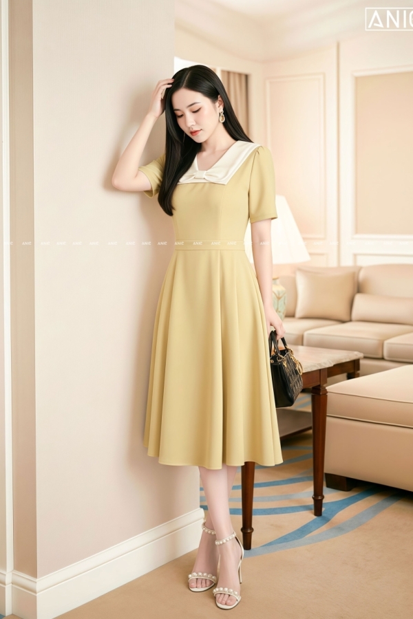 Đầm Vàng Nơ Phối Cổ Kem - AN2624