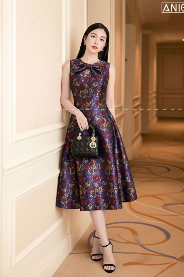 Đầm Tiệc Gấm Tím Hoa Nơ